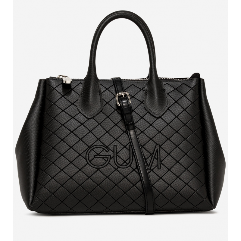 Borsa a mano misura media nero opaco. Fantasia Matellassè con logo GUM. Bottoni a pressione laterali della borsa. Manici rigidi. Ganci per tracolla applicati lateralmente. Chiusura con cerniera in nikel e tira zip. Tracolla in ecopelle regolabile e removibile tramite moschettoni. Misure borsa: 30 x 23 x 15 cm. Lunghezza tracolla: 110 estendibile fino a 125 cm circa. Custodia protettiva.