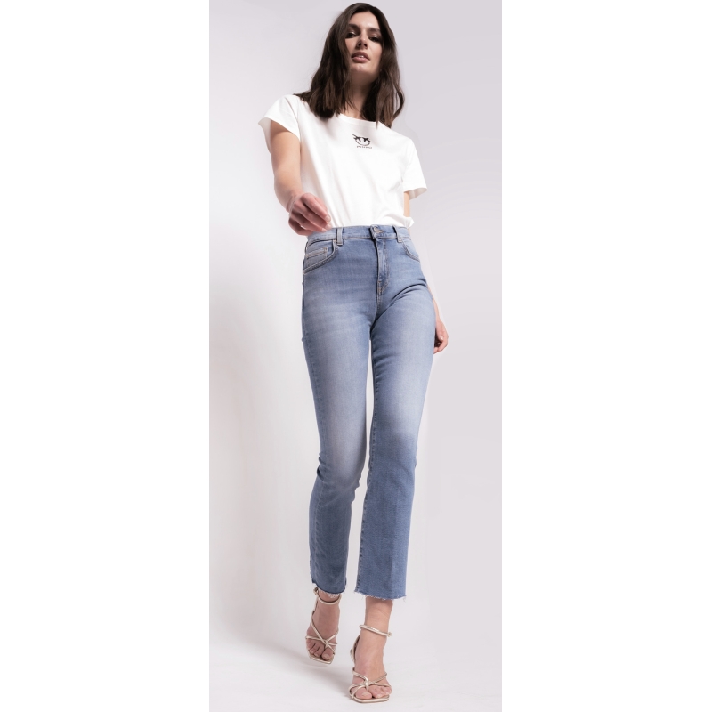 Jeans cinque tasche bootcut flare-fit in denim blue stretch. Vita regular, gamba dalla linea slim, leggermente svasata al fondo, e lunghezza alla caviglia. Chiusura con zip e bottone a chiodo in metallo.