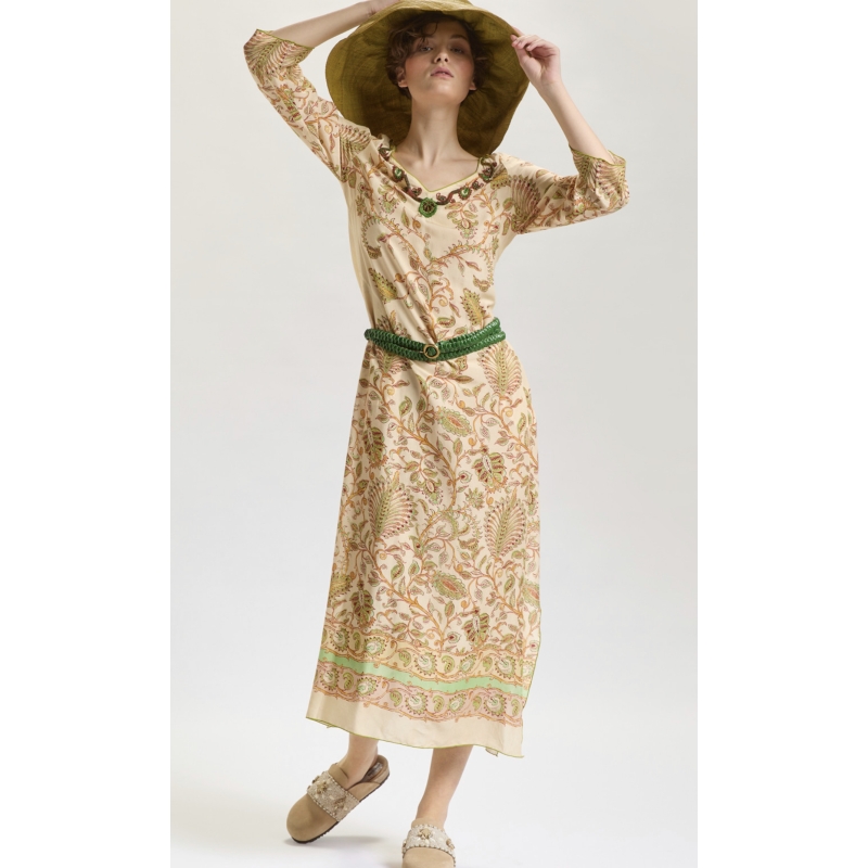 Abito caftano in viscosa leggera stampata con greca al fondo, ricamo snake di pailette e motivi floreali in filo perline e cut. Dettaglio ricamato su centro. Scollo a V e manica a 3/4.