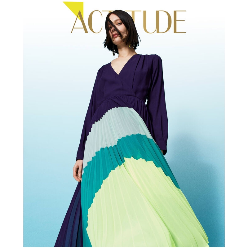 Abito lungo collezione Actitude in crêpe de Chine con intarsi color block plissé in georgette, zip al fianco.