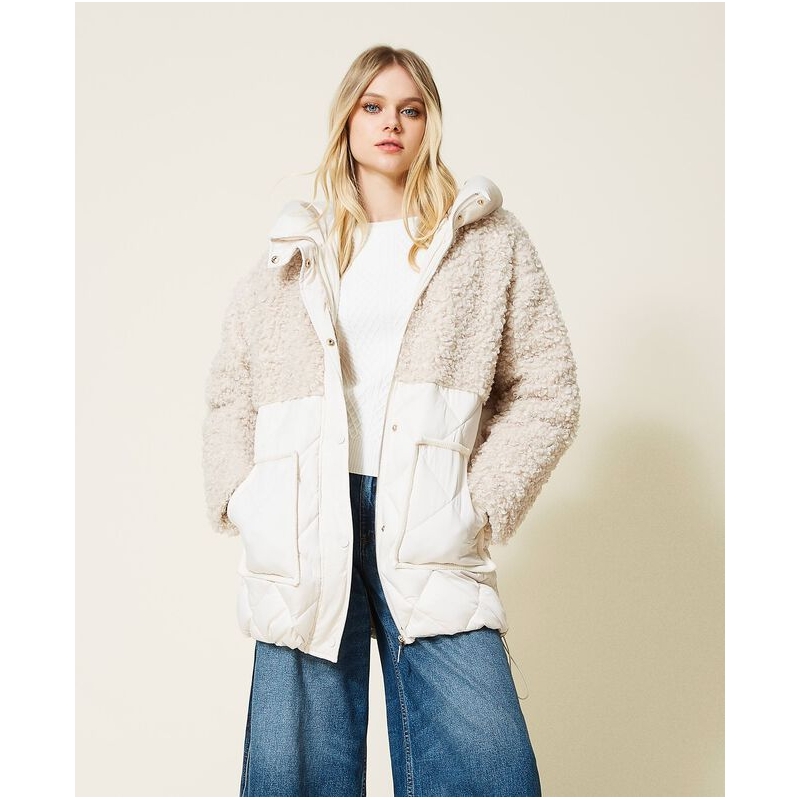 Giubbino in nylon trapuntato con inserto in pelliccia sintetica, zip coperta da patta, coulisse al fondo, linea ampia.