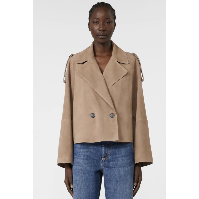 Trench corto con alamari sulle spalle e mantellina sulla schiena.