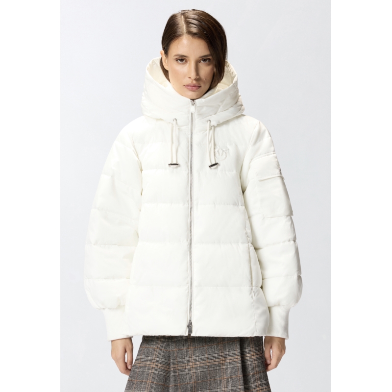 Piumino corto imbottito in tela tecnica dalla silhouette leggermente a campana. Il modello si distingue per il look di stampo più sportivo, dato dal finishing opaco del tessuto, e per gli elementi funzionali, come le tasche con zip invisibile, la lavorazione in maglia a costine su collo alto e polsini, e l'ampio cappuccio regolabile con coulisse d'ispirazione trekking dotato di visiera per ripararti dalla pioggia. La patch con logo Love Birds effetto gommato davanti, lato cuore personalizza il capospalla in puro stile PINKO. Chiusura con zip in metallo davanti, doppio cursore. Modello foderato.1° Tessuto Esterno: POLIESTERE 100% - 2° Tessuto Esterno: POLIESTERE 98% ELASTAN 2% - 1° Fodera: POLIESTERE 100% - 1° Fodera: POLIESTERE 100% - Imbottitura: POLIESTERE 100%