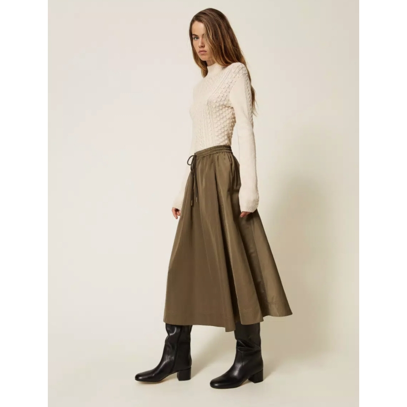 Gonna longuette in taffetà con elastico impunturato in vita e coulisse con terminali in metallo. Ha tasche inserite ai fianchi tagli laterali impunturati, orlo alto al fondo, placchetta logo in metallo sul retro, linea ampia.