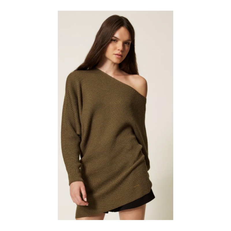 Maglia in misto lana seamless con lavorazione a costa inglese. Ha scollo a barchetta asimmetrico, maniche lunghe, arricciatura laterale, placchetta logo in metallo davanti, linea morbida.