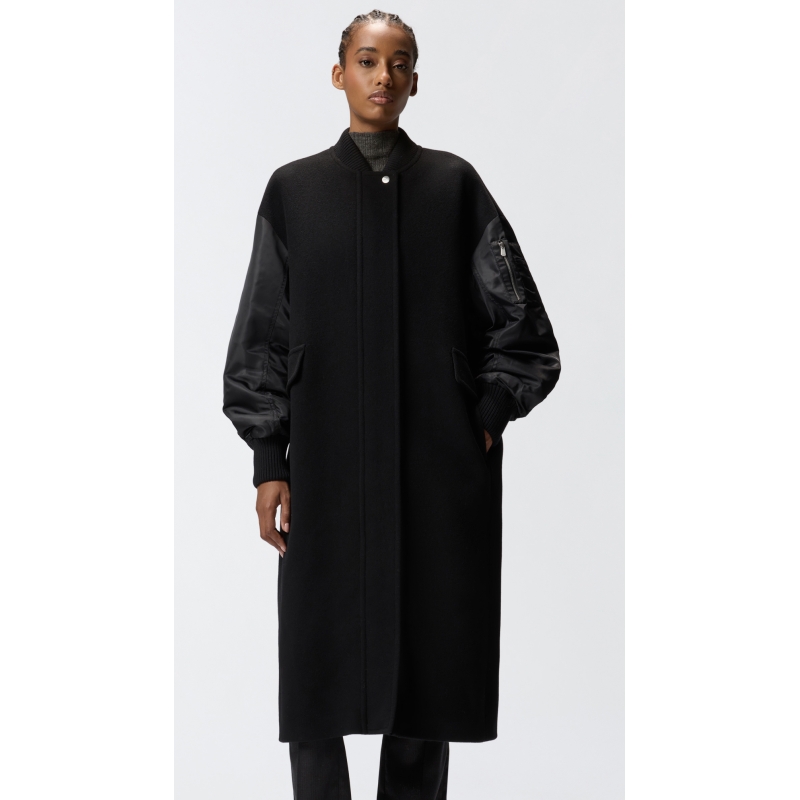 Cappotto lungo foderato con collo bomber, tasche a pattina e tasca con zip su una manica. Il modello è realizzato in caldo e morbido panno di misto lana con maniche lunghe in satin tecnico. Lavorazione a costine su collo e polsini. La chiusura è nascosta, soltanto il primo bottone è visibile