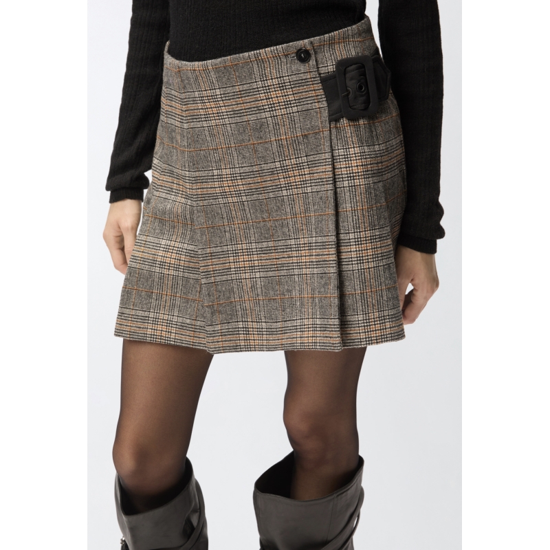 Gonna corta dalla silhouette leggermente svasata, caratterizzata da una chiusura a portafoglio con bottone decentrato sul davanti. Il tessuto in misto lana tinto in filo è arricchito da un motivo a quadri d'ispirazione principe di Galles, mentre il tocco finale è dato dalla cintura a contrasto presente su un lato