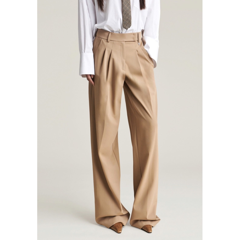 I PANTALONI LINDA DAL TAGLIO BAGGY SONO PERFETTI PER CHI CERCA ELEGANZA E LIBERTÀ DI MOVIMENTO. IL MODELLO HA GAMBA AMPIA CON PINCES E PIEGA CENTRALE CHE DANNO STRUTTURA AL LOOK. LE TASCHE A FILETTO SUL RETRO NE ESALTANO LA COSTRUZIONE MINIMAL E SARTORIALE.