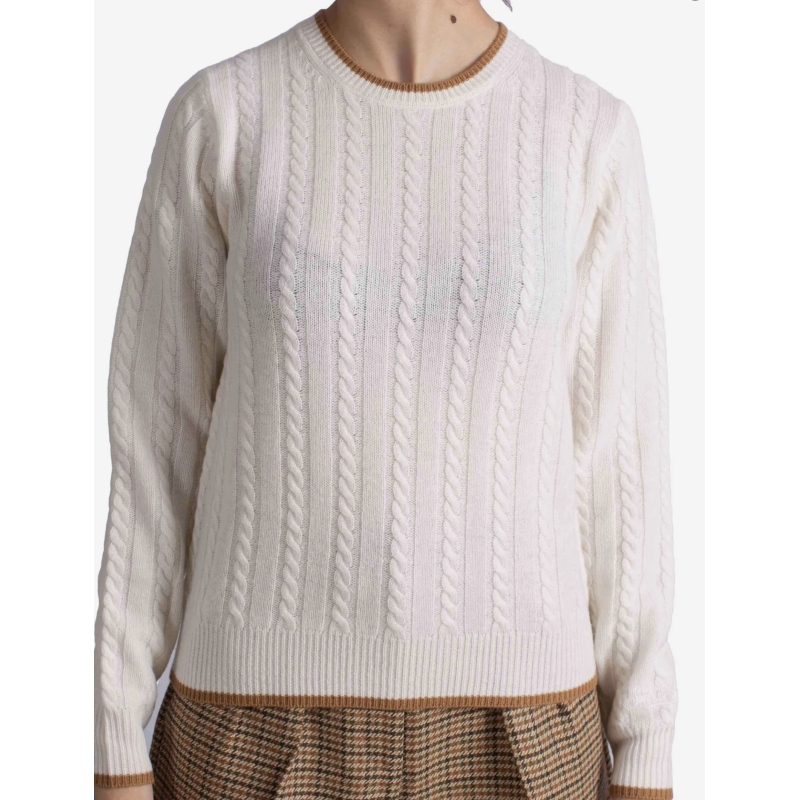 maglia MC2 Saint Barth da donna è realizzata in 100% lana,design a lavorazione treccia verticale conferisce al capo un look classico e femminile, mentre i profili a contrasto color cammello su collo, fondo e polsini aggiungono un tocco moderno e distintivo. Il modello presenta collo tondo, maniche lunghe e vestibilità regolare,