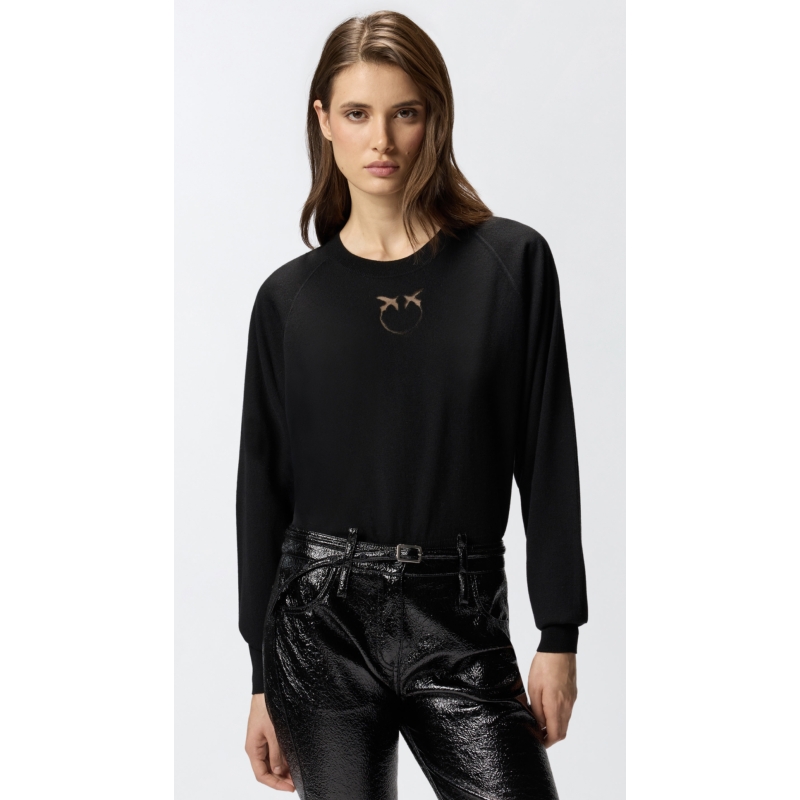 Maglia girocollo a maniche lunghe in pura lana merino, estremamente leggera e versatile. La parte frontale è caratterizzata dall'iconico logo Love Birds sotto forma di intarsio in trasparenza lavorato con tecnica dévoré che esprime appieno il DNA del brand. Il retro del capo, invece, sfoggia una cucitura a vista che ricorda la forma di un carré. Girocollo, orlo e polsini sono lavorati a coste.