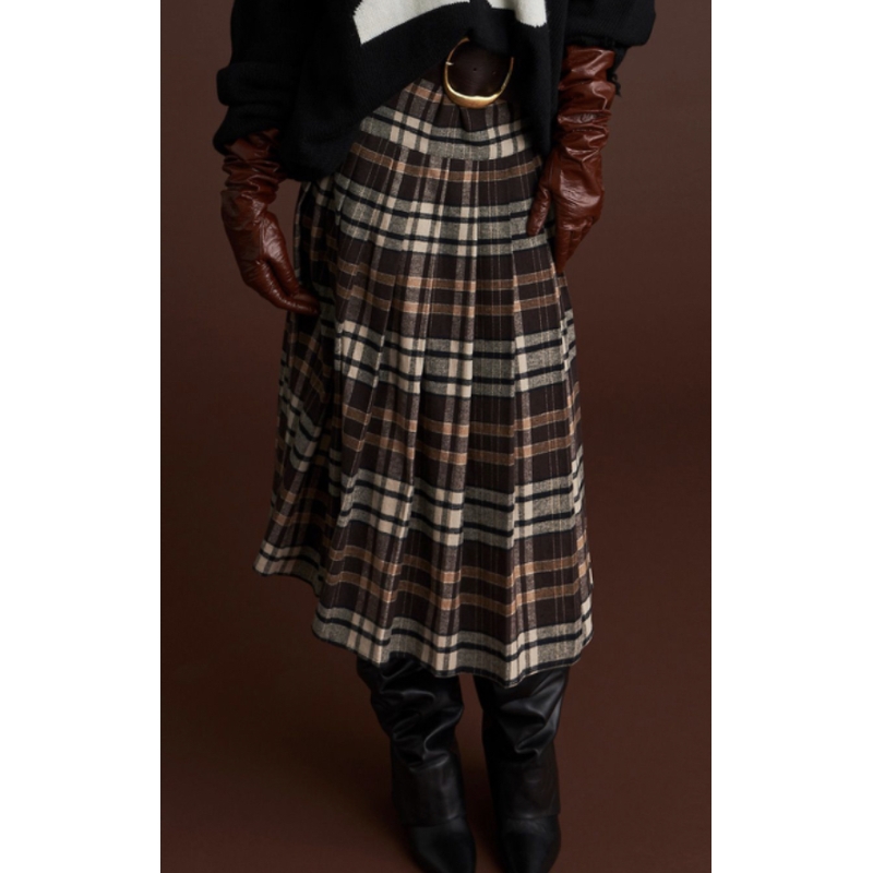 LA GONNA GWEN GIOCA CON LE ISPIRAZIONI SCHOOL GIRL IN CHIAVE CONTEMPORANEA. REALIZZATA IN FLANELLA DI MISTO COTONE, PRESENTA UN MOTIVO CHECK ALL OVER E UN DESIGN A PLISSÉ CHE CREA MOVIMENTO E STRUTTURA. I CINTURINI LATERALI CON FIBBIE REGOLABILI AGGIUNGONO UN TOCCO UTILITY E GRINTOSO AL DESIGN