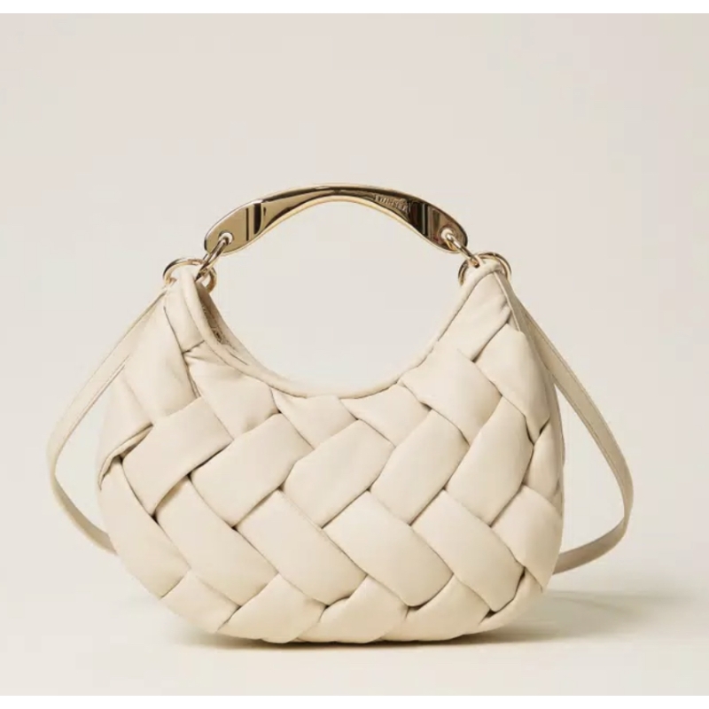 Borsa ‘Croissant’ effetto nappa di agnello costruita con tubolari intrecciati a mano imbottiti in leggera ovatta all’interno per dare volume. Ha chiusura con zip, manico rigido in metallo con logo inciso, tracolla cross-body rimovibile, foderata.