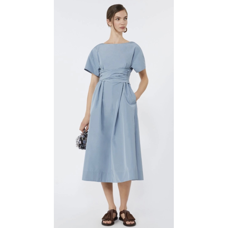 Abito midi con gonna svasata e fusciacche da annodare in vita che evidenziano la silhouette.