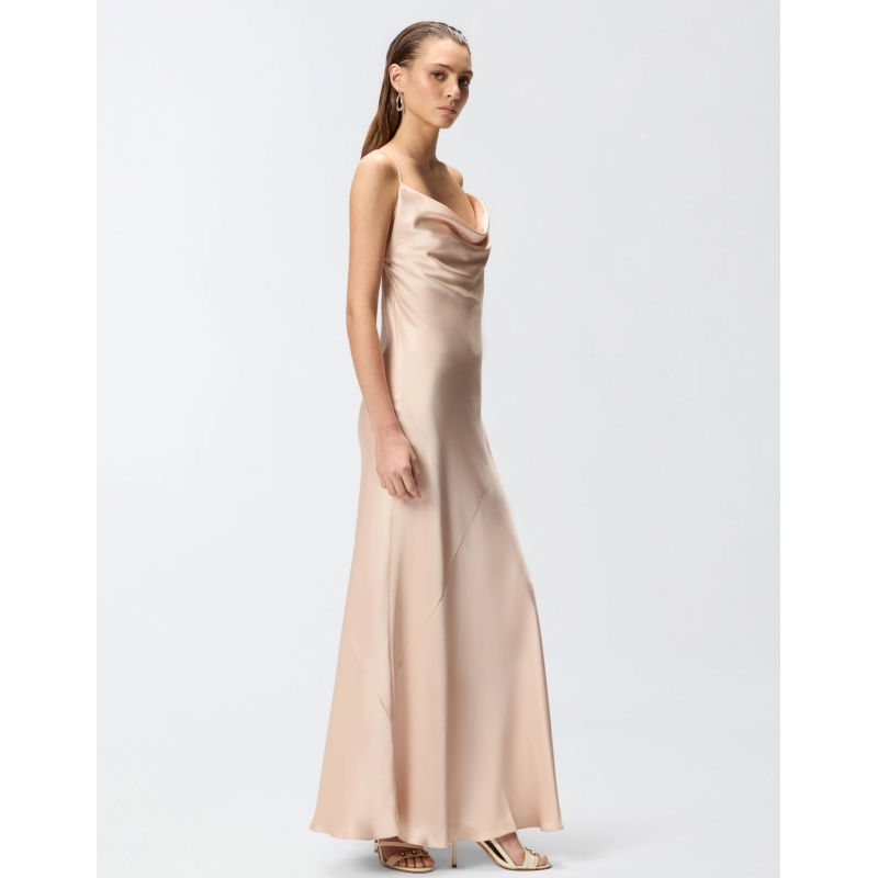 Abito lungo dalla silhouette a sottoveste con spalline sottili, morbido scollo frontale drappeggiato e ampio scollo tondo sul retro che lascia la schiena scoperta, attraversata solo da due nastrini da annodare al centro. Il modello firmato PINKO è realizzato in morbido e lucente satin double face, un tessuto dall'aspetto uniforme sia all'esterno sia all'interno, che accompagna il corpo con delicatezza e permette di ottenere una vestibilità fluida e leggera.