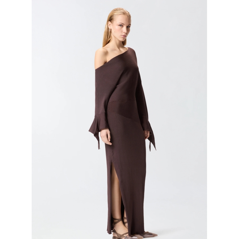 Abito lungo con silhouette aderente ma confortevole, messa in risalto dal tessuto in rayon lucente lavorato a costine. Il modello è contraddistinto da uno scollo asimmetrico che lascia una spalla scoperta, e da maniche lunghe completate da un dettaglio giocoso e raffinato sul fondo: due lembi d'ispirazione bandana da allacciare in un semplice nodo, per un look più fresco, o in un fiocco, per un risultato più femminile. Il tocco finale è dato dall'etichetta con logo lettering PINKO sul retro.