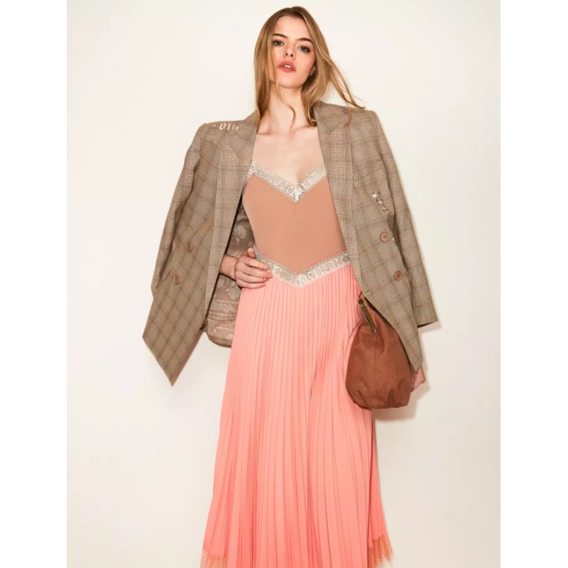 Abito longuette firmato dall’artista Myfo per la collezione Actitude in crêpe de Chine con gonna lavorata a plissé e pizzo al fondo. Ha spalline sottili, scollatura a V davanti, tagli con applicazione di pizzo logato, linea dritta.